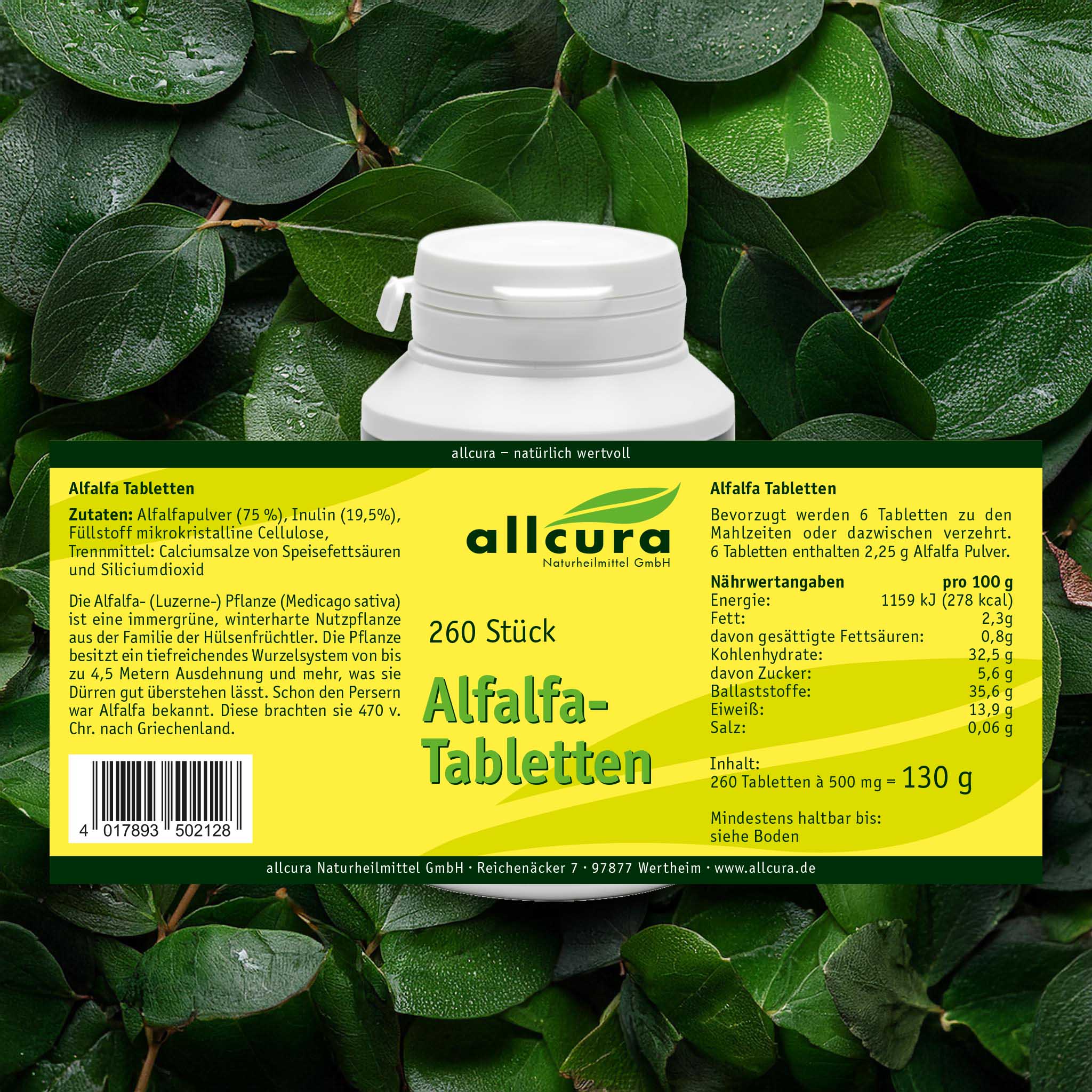 6 Tabletten enthalten 2250 mg Alfalfapulver und 585 mg Inulin.
