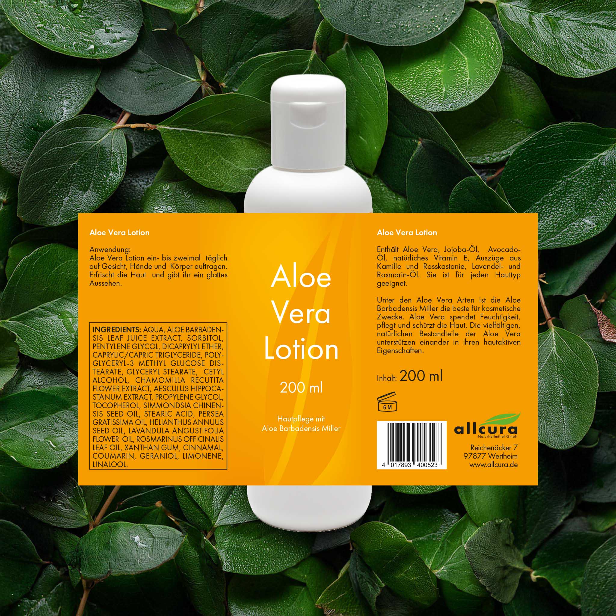 Aloe Vera Lotion zieht gut in die Haut ein und hinterlässt einen seidig matten Schimmer. Erfrischende Zubereitung mit Aloe barbadensis Miller, Jojoba-Öl, natürlichem Vitamin E, Auszüge aus Kamille und Rosskastanie, Lavendel- und Rosmarin Öl.