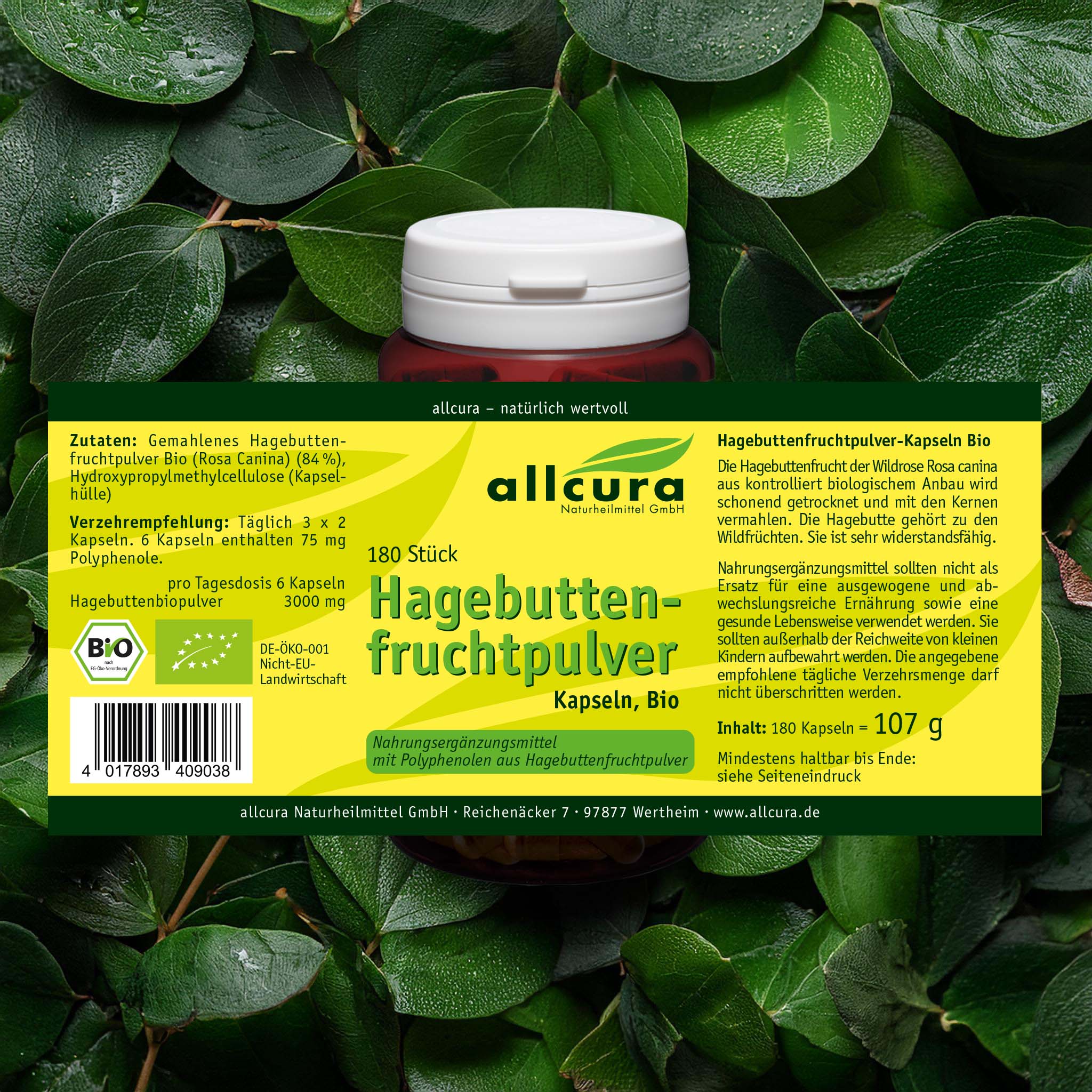 Die Hagebuttenfrüchte stammen aus kontrolliert biologischem Anbau und enthalten sowohl die Schalen als auch die Kerne mit all seinen natürlichen sekundären Pflanzenstoffen und einen gewissen Teil der Härchen aus der reifen Frucht. Die Hagebutte ist die Frucht der Heckenrose (Rosa canina) und gehört wie der Sanddorn zu den heimischen Früchten. Die reife Hagebutte aus Bio-Anbau wird vollständig in einem modernen Verfahren durch Gefriertrocknung und schonende Vermahlung zu einem aktiven Pulver aufbereitet und in schützende Zellulosekapseln gebracht.
