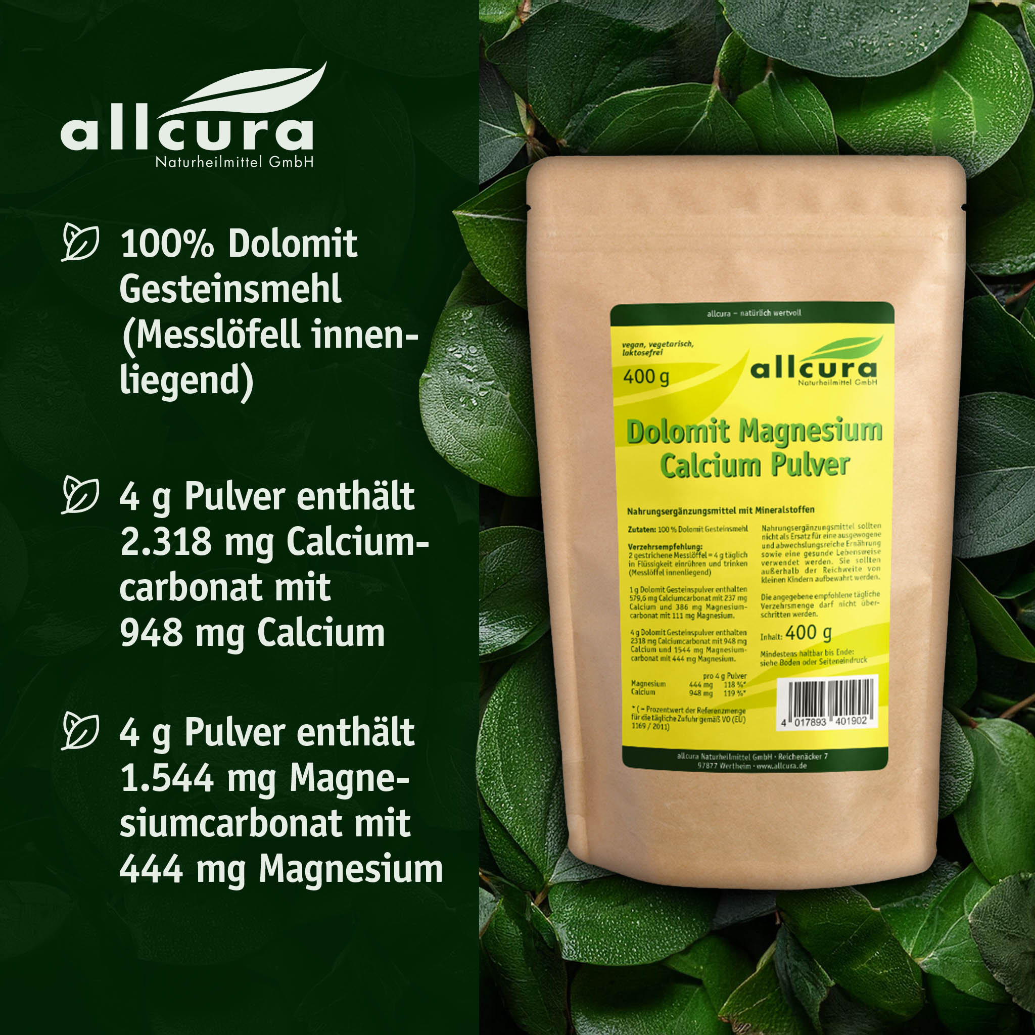 4 g Dolomit Gesteinspulver enthalten 2318 mg Calciumcarbonat mit 948 mg Calcium und 1544 mg Magnesiumcarbonat mit 444 mg Magnesium