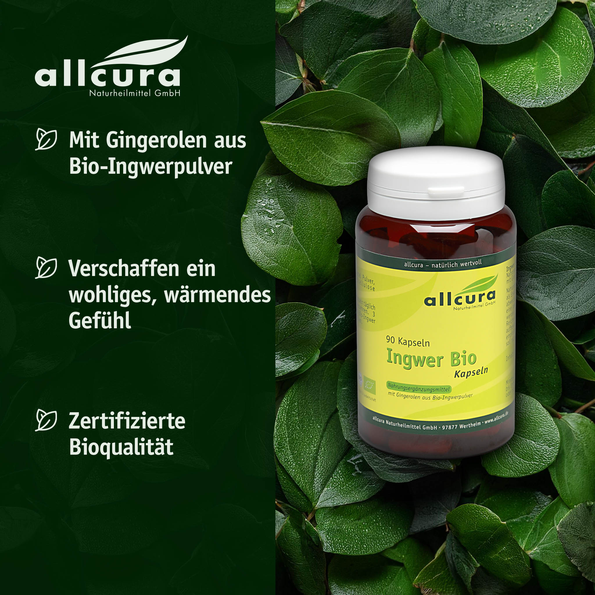 3 Kapseln enthalten 1500 mg Bio Ingwer Pulver mit 37,5 mg Gingerolen.