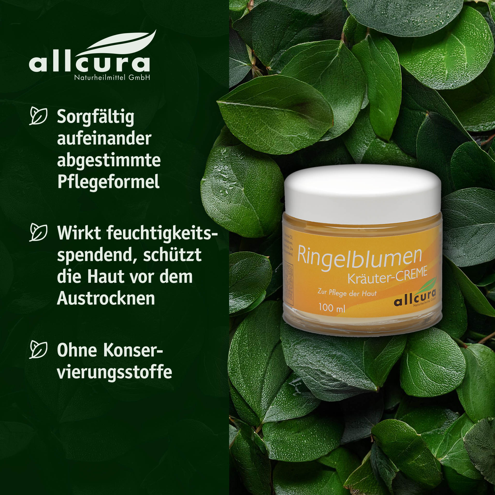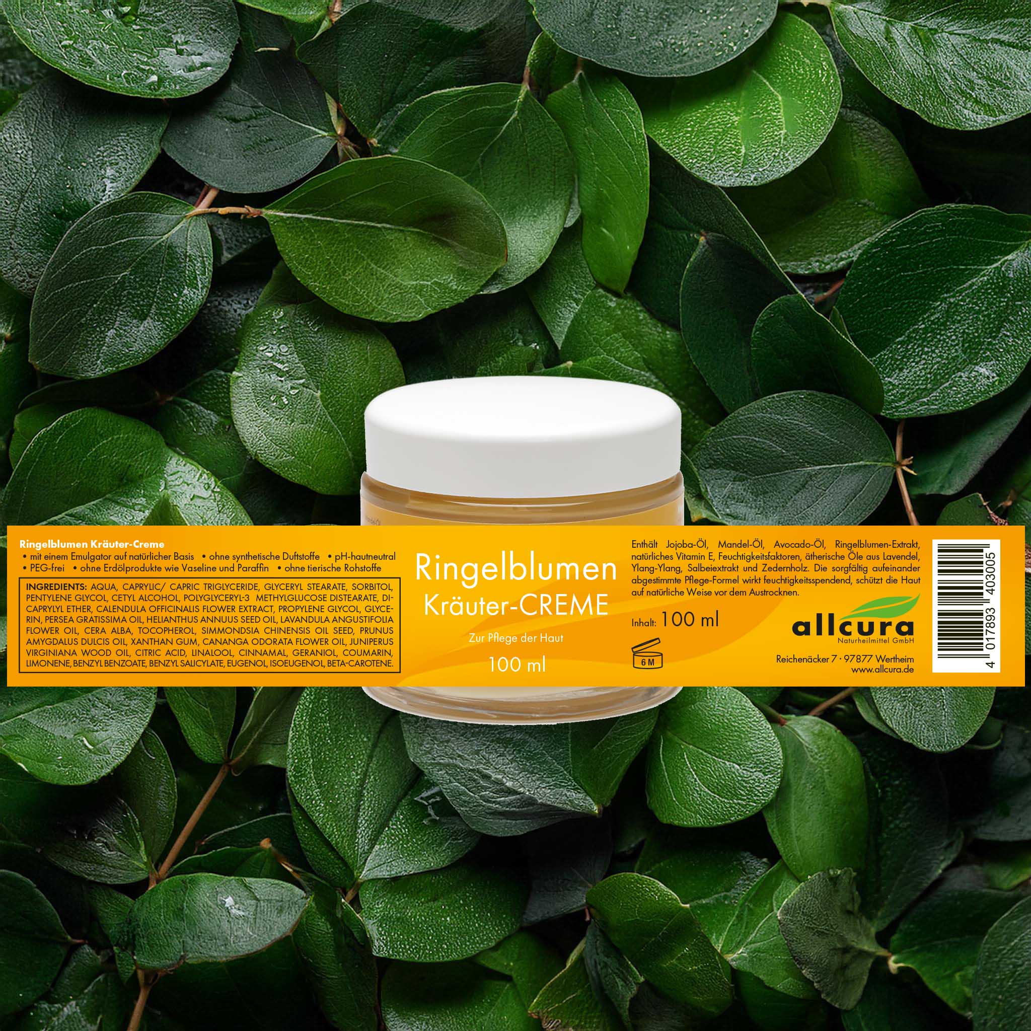 Ringelblumen-Creme enthält Jojoba-Öl, Mandel-Öl, Avocado-Öl, Ringelblumen-Extrakt, natürliches Vitamin E, Feuchtigkeitsfaktoren, ätherische Öle aus Lavendel, Ylang-Ylang und Zedernholz. Die sorgfältig aufeinander abgestimmte Pflege-Formel wirkt feuchtigkeitsspendend, schützt die Haut auf natürliche Weise vor dem Austrocknen.