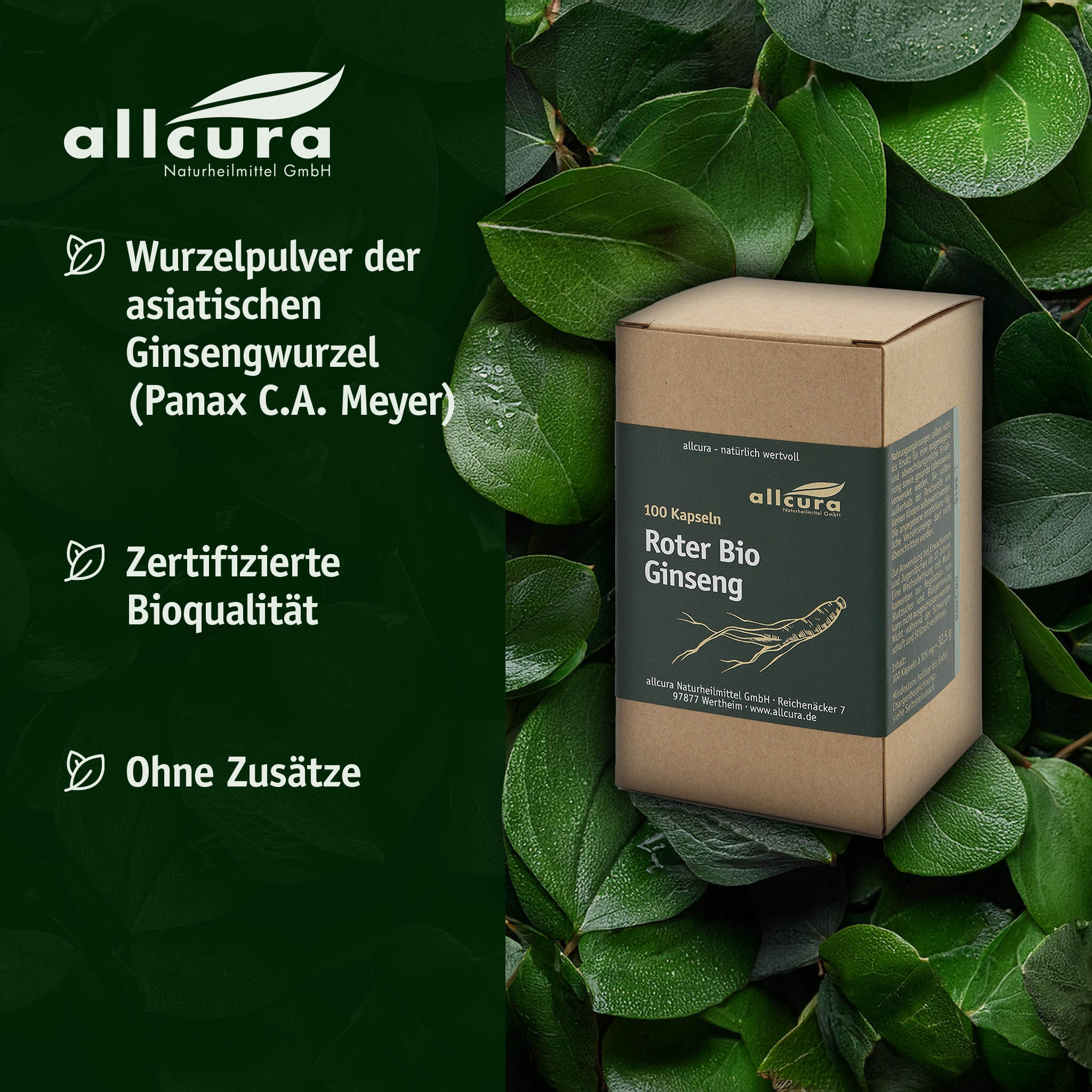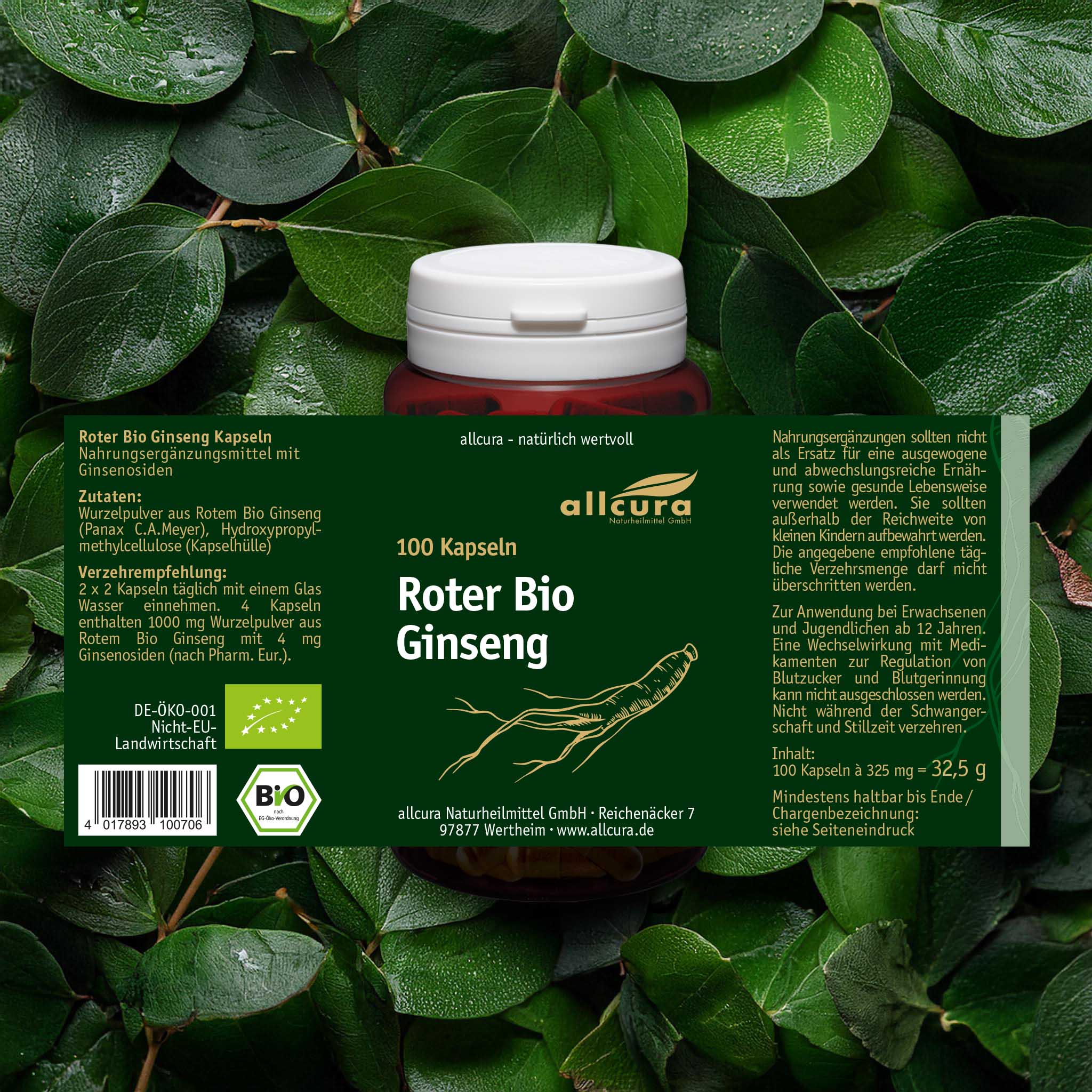 4 Kapseln enthalten 1000 mg Wurzelpulver aus Rotem Bio Ginseng mit 4 mg Ginsenosiden (nach Pharm. Eur.).