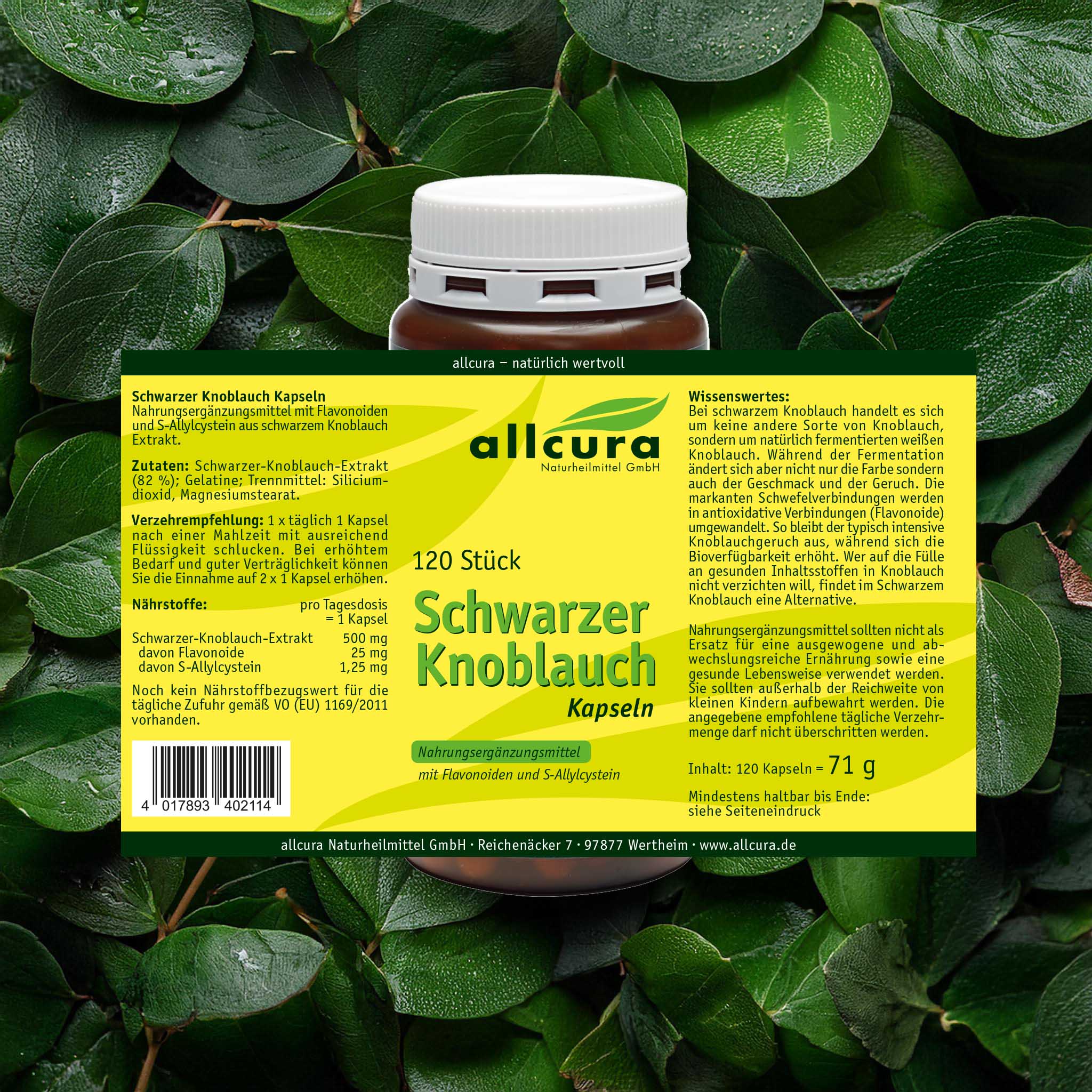 Schwarzer-Knoblauch-Extrakt (82%); Gelatine; Trennmittel: Siliciumdioxid, Magnesiumsalze der Speisefettsäuren.